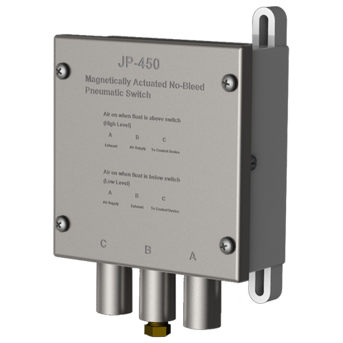 PNEUMATIC LEVEL SWITCHThe JP-450 is a magnetically actuated “no bleed” pneumatic point level switch for use with magnetic liquid level indicators. Magnetic coupling through the chamber wall keeps the switch isolated from process fluid and pressure, allowing setpoints to be adjusted on the fly. Two JP-450’s can be coupled with a JPLR latching relay to give plug-and-play dump/fill valve control (see JP-450 data sheet).